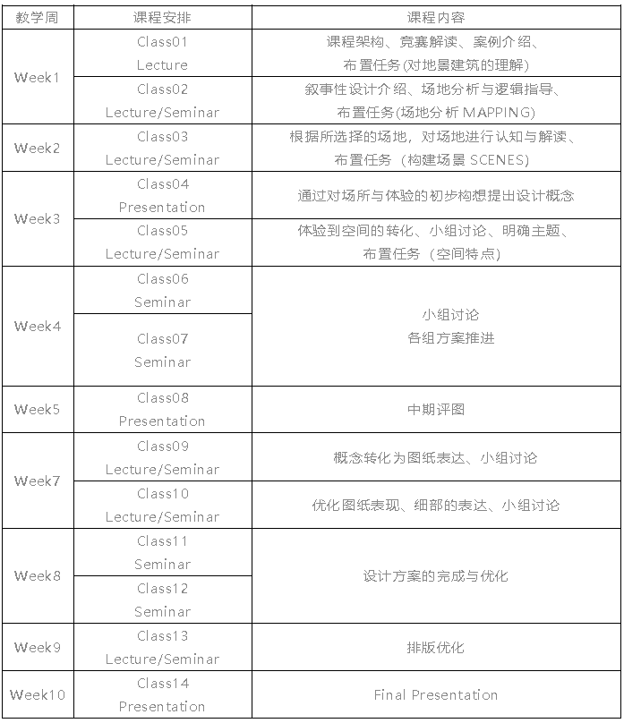 § 设计过程中鼓励学生对题目有深入的解读,包括且不限于材料,美学,空间的组织等方面,并且对在地文化,人文景观,适应性有一定的研究兴趣;
