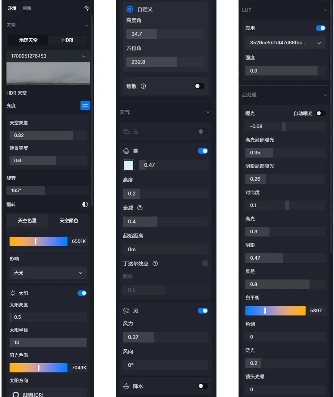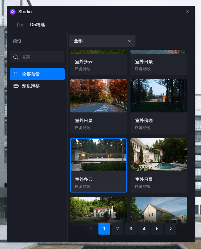一个好的HDR是定调整个效果图氛围的核心,我个人会更喜欢无明显光照方向,易出效果的阴天氛围HDR,像本次效果图使用的就是D5官方预设中的室外阴天,再自己稍微调整一下,相关参数放在后面了。