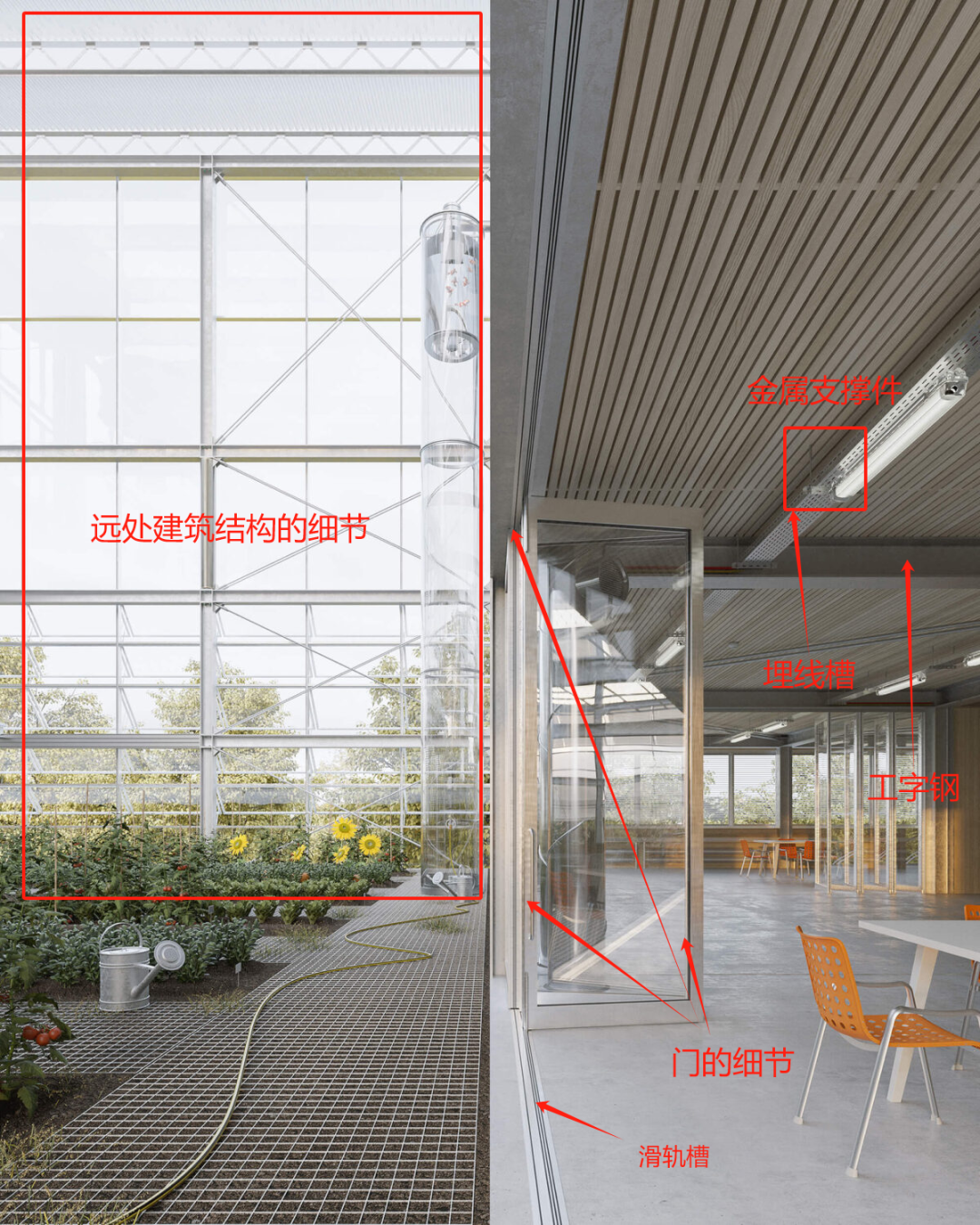 举例子,像下图中Jan Kinsbergan事务所(大家可以多学习他们事务所的效果图表达!)的一张效果图表达中,图中所示细节都是我们可以去增加模型精度的方向,我们前期在建模的时候都可以去尽可能的将模型按照这样的思路去细化(tip:善用rh的图块功能,模型就不会这么卡)。