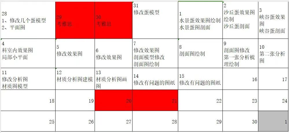 其实这个问题很难得到两全其美的解决方法,因为时间紧迫,任务必须要解决,而自己的身体状况也是无法避免的。我只有通过积极配合治疗,并且多和身边的人沟通来调整自己。而在学习上,这要感谢我的作品集老师的建议,他建议我用excel列好每日的计划,完成之后在上面标注,按照自己的状况尽力完成,这种方法大大提升了我的工作效率,让我能在deadline之前顺利地完成任务。