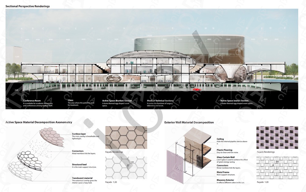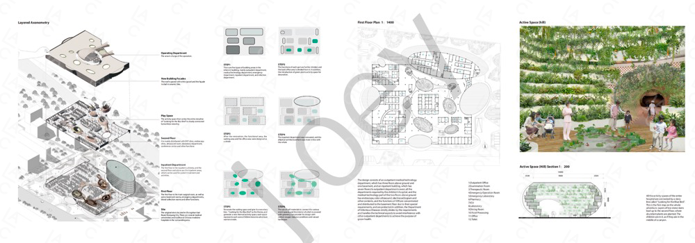 我最喜欢的项目其实是我项目中的医院设计。这个项目是在我本科的儿童医院设计的基础上进行了二次改造。当时选择这个项目的原因是医院作为我的高年级单体建筑设计作业,内部功能复杂,对场地流线组织的要求也很严格。我希望能够通过这个作品来展示我的基本功。另外,医院作为一个比较特殊的场所,利用设计中能够很好的展示人文关怀。
