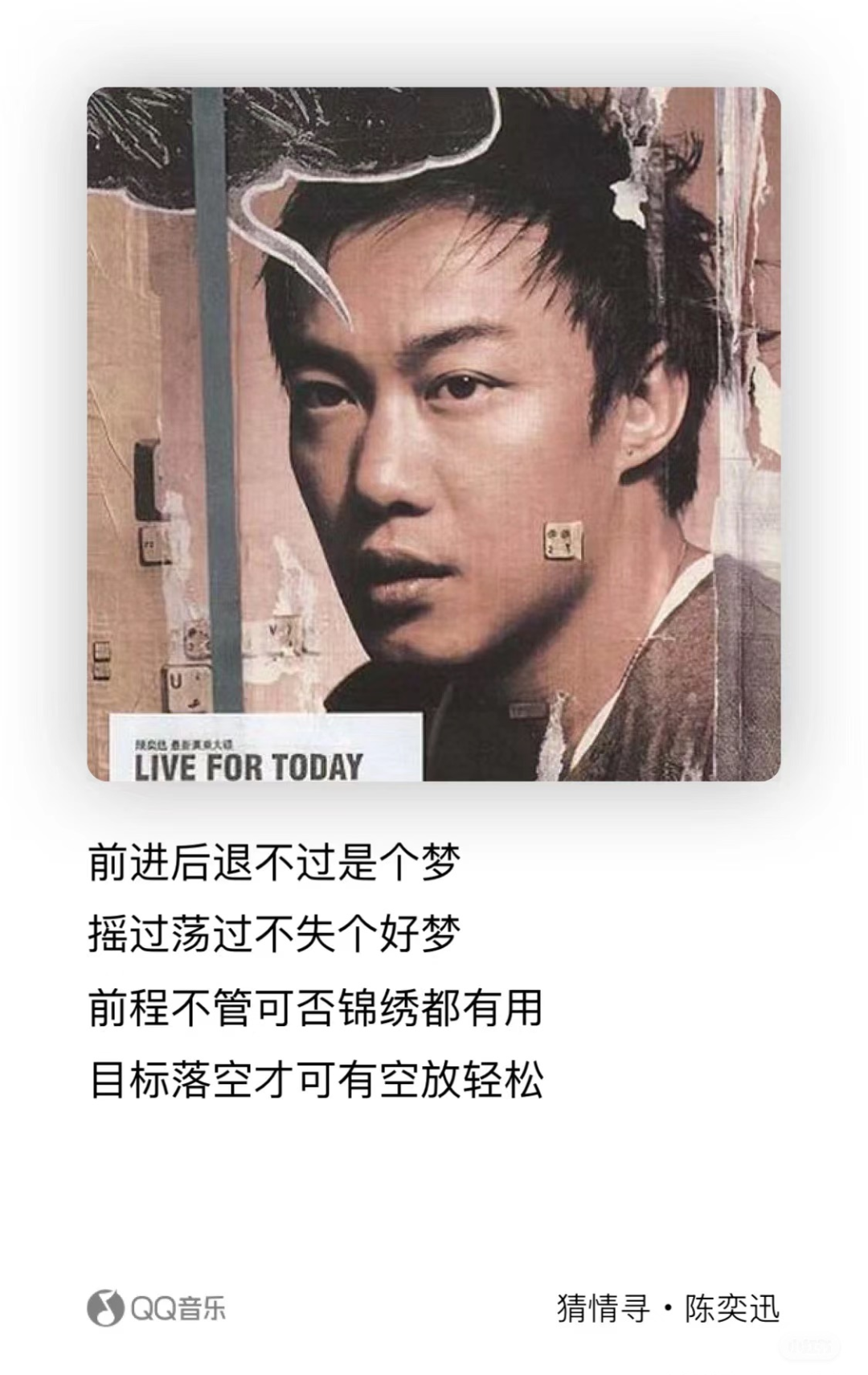我其实想推荐一首歌——《猜情寻》,在过去我一直以为我的人生是《葡萄成熟时》,等候葡萄酿成甘甜的红酒,我在等待我人生的下一刻的转机。可是在完成投递的那天,我意外听到了这首《猜情寻》,突然一下,我茅塞顿开。游戏输赢又如何?谁说你要战胜别人,你只要玩在当下,留下欢乐便无憾。即便是考研失利,即便是投递中遇到的诸多不顺,那都是一场游戏,参与过了就好。