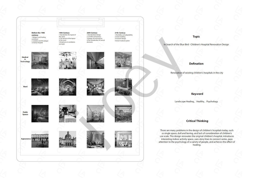 现如今医院设计存在着很多需要改进的地方,例如缺乏等候区域,环境压抑等问题。在满足医院基本功能的情况下,我认为作为设计者应该关注的这些问题,另外,作为一个儿童医院,儿童以及家长的使用心理也需要被关注。所以我将视点放在了医院的疗愈性设计中。